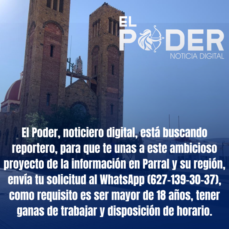 El Poder, noticiero digital, está buscando reportero, para que te unas a este ambicioso proyecto de la información en Parral y su región, envía tu solicitud al WhatsApp (627-139-30-37), como requisito es ser mayor de 18 años, tener ganas de trabajar y disposición de horario.
