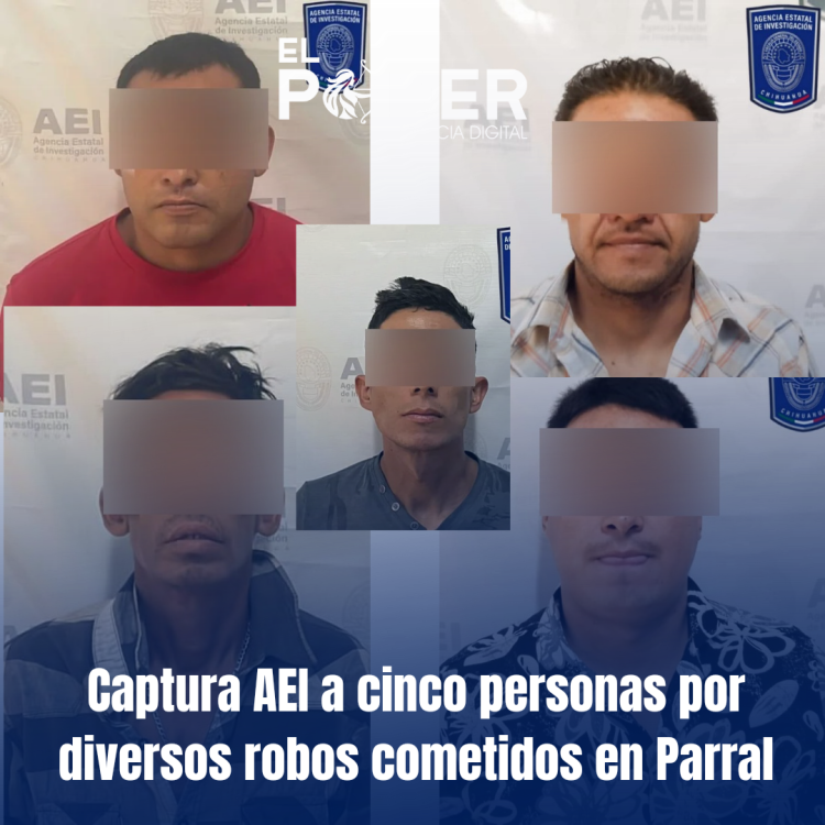 Elementos de la Agencia Estatal de Investigación (AEI) adscritos a la Fiscalía de Distrito Zona Sur, detuvieron mediante orden de aprehensión a cinco masculinos que aparecen como probables responsables de diversos robos cometidos en la ciudad de Parral.