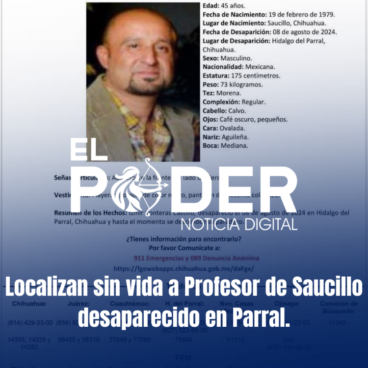 Dicha persona contaba con reporte de desaparición interpuesto el día 08 de agosto del año en curso, en la ciudad de Parral.