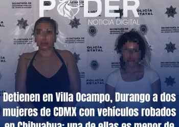 Detienen en Villa Ocampo, Durango a dos mujeres de CDMX con vehículos robados en Chihuahua; una de ellas es menor de edad.