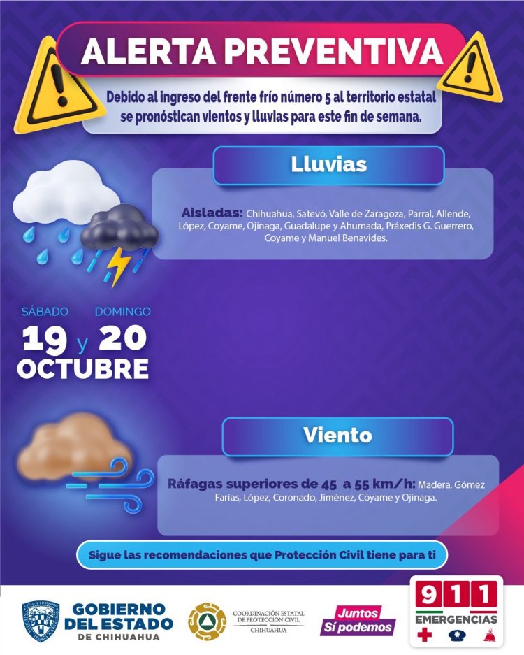Además, se prevé la presencia de vientos, con rachas que pueden superar los 55 kilómetros por hora (km/h) en Juárez, Ahumada, Palomas, Ascensión, Janos, Casas Grandes, Nuevo Casas Grandes, Madera, Ignacio Zaragoza, Gómez Farías, Chihuahua, Aquiles Serdán, Satevó, Valle de Zaragoza, Huejotitán y Parral.