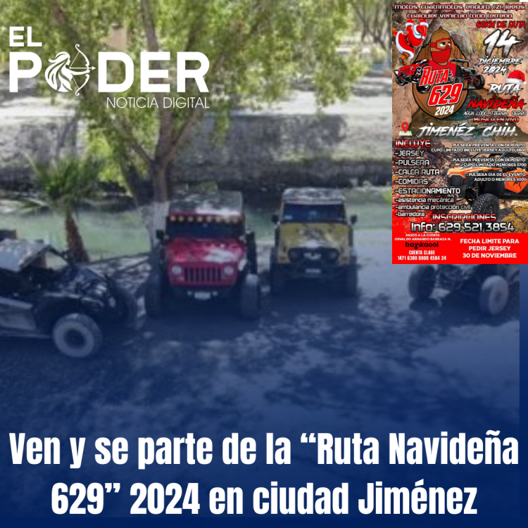 A ti que te gusta la aventura se te invita a que seas parte de la “Ruta Navideña 629” 2024, de motos, cuatrimotos, enduro, rzr, jeeps y cualquier vehículo todo terreno, la cual se realizará el día 14 de diciembre en la ciudad de Jiménez, Chihuahua.