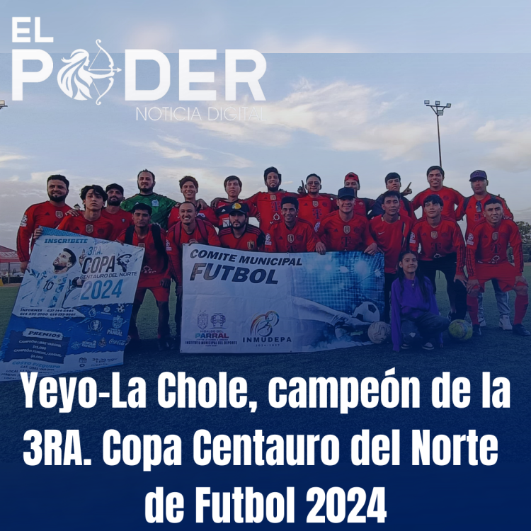 El representativo de Yeyo-La Chole, se proclamó como campeón de la 3RA. Copa Centauro del Norte de Futbol 2024, al imponerse en la final de la categoría libre varonil, tres goles por dos, al equipo FC Sear, en acciones efectuadas el fin de semana en las instalaciones de la Unidad Deportiva CNOP.