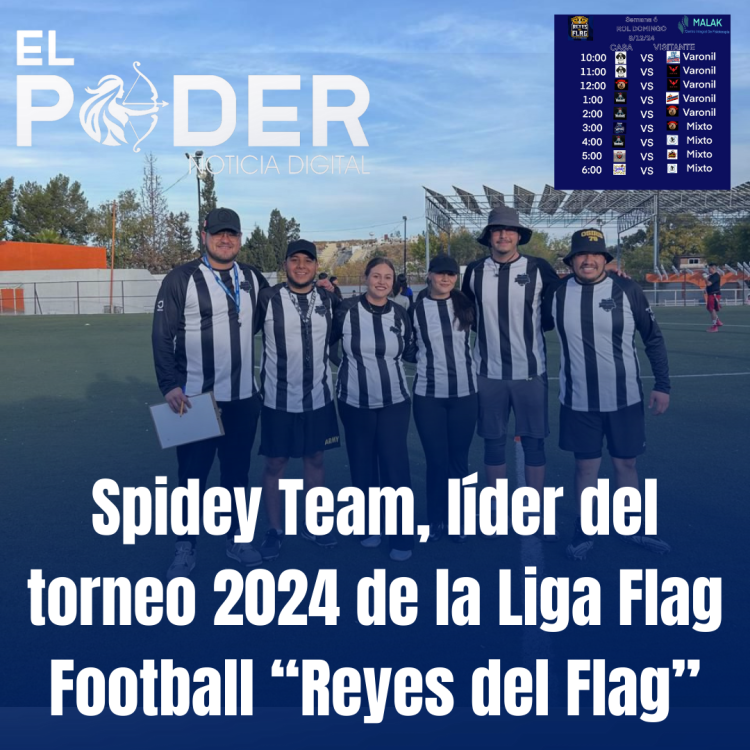 Con marca de cuatro victorias y una derrota el combinado de Spidey Team, es el actual líder del primer torneo de la naciente Liga Flag Football “Reyes del Flag”, que se desarrolla exclusivamente el día domingo, teniendo como escenario la cancha de la Unidad Deportiva Emiliano Zapata.