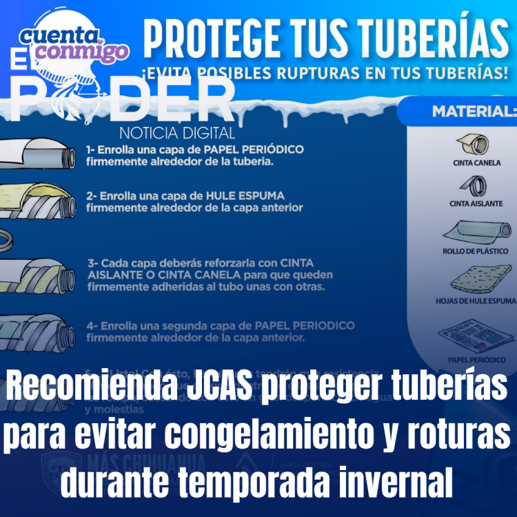 La Junta Central de Agua y Saneamiento (JCAS) exhorta a la población a tomar medidas de prevención para reducir el riesgo de congelamiento y rotura de tuberías durante la temporada invernal.