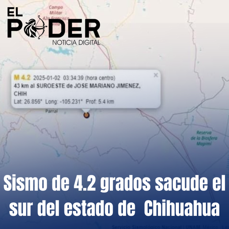 La madrugada de este jueves, 2 de enero, un sismo de magnitud 4.2 en la escala de Richter sorprendió a los habitantes del sur del estado de Chihuahua. El Servicio Sismológico Nacional informó que el movimiento telúrico se registró a las 3:34 horas, con epicentro localizado a 43 kilómetros al suroeste del municipio de Jiménez.