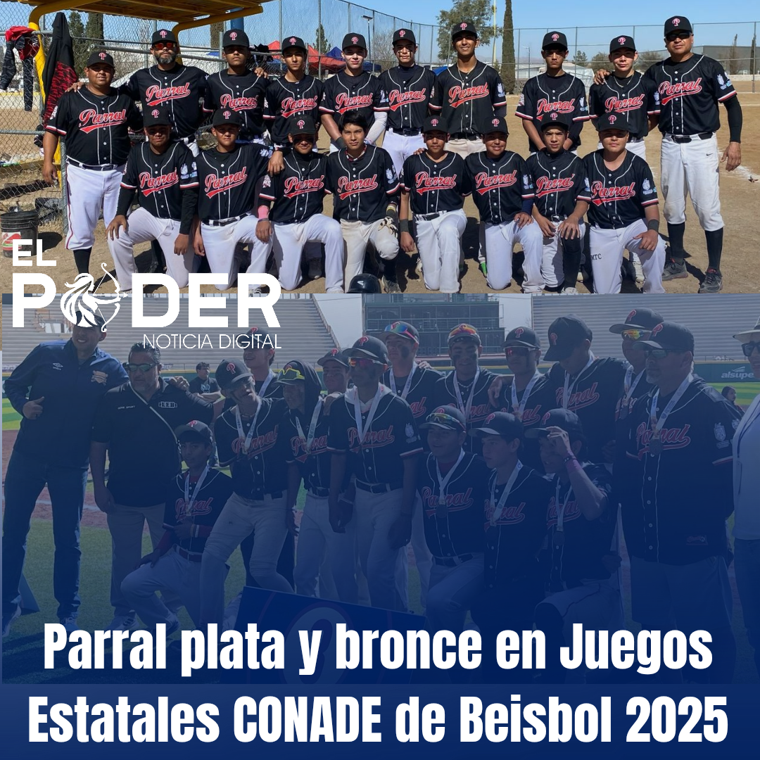 El representativo de Parral 13-14 años se colgó la plata y el 15-16 años el bronce, dentro de os juegos Estatales CONADE de Beisbol 2025, tras caer en la final ante Chihuahua y por tener el mejor record de carreras admitidas, respectivamente, en actividad efectuada el fin de semana en la capital del estado.