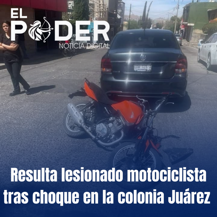 Parral, Chihuahua.- Otro motociclista resultó lesionado tras un choque contra un vehículo en calles de la colonia Juárez; fue el presunto responsable tras omitir el alto.