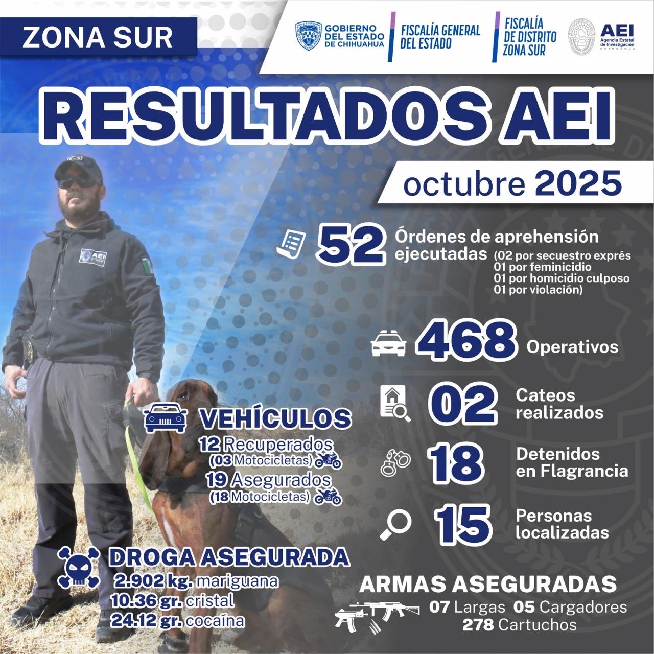 Durante el mes de octubre, la Agencia Estatal de Investigación (AEI) obtuvo resultados significativos como o parte de los trabajos de combate a los delitos y en las acciones de procuración de justicia en la región sur de la entidad.