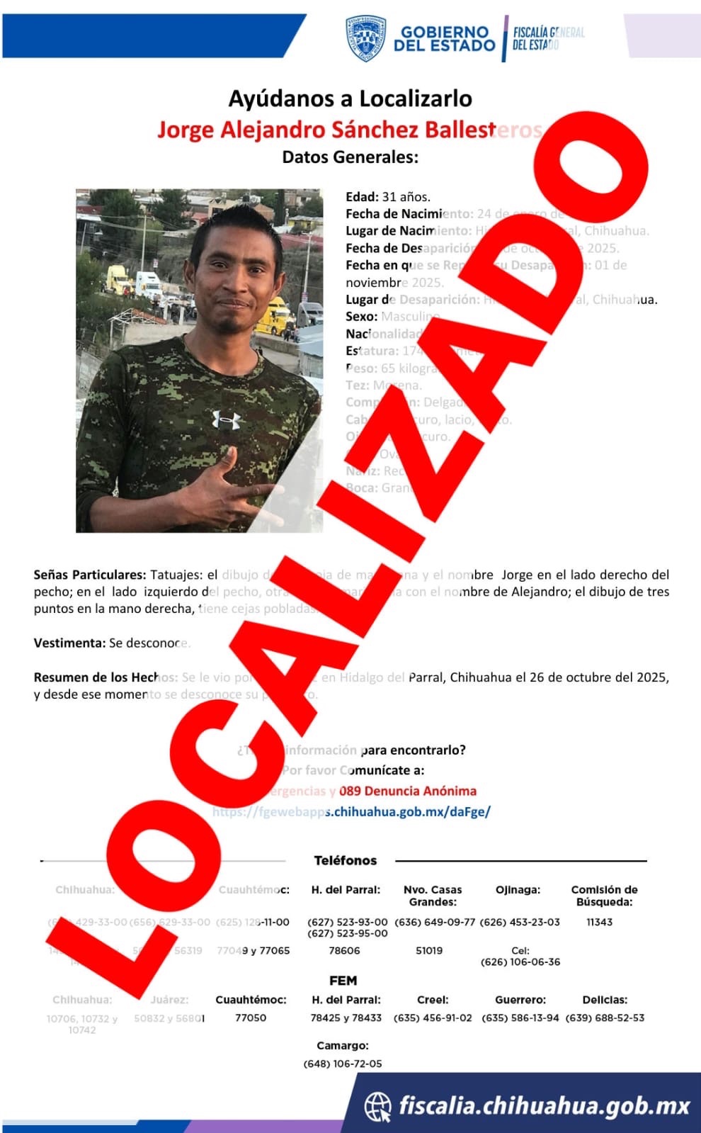 Mediante la aplicación de los protocolos de búsqueda y el trabajo de investigación ministerial, la Fiscalía de Distrito Zona Sur, localizó sano y salvo a Jorge Alejandro S. B., quien tenía reporte de ausencia interpuesto el 01 de noviembre del presente año, en la ciudad de Parral.