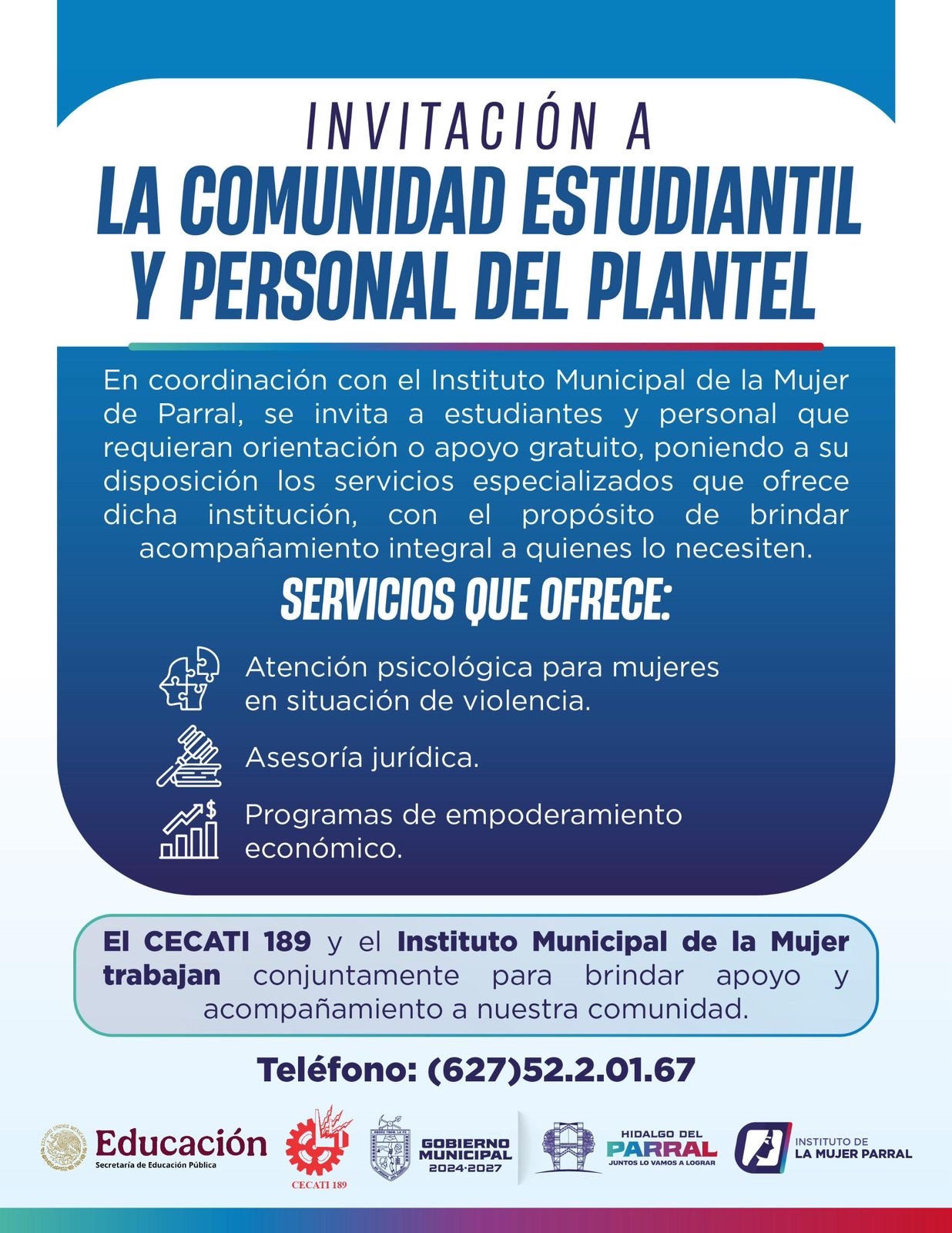 El Gobierno de Parral, a través del Instituto Municipal de la Mujer (IMM), reforzó la coordinación con el CECATI 189 con el propósito de ofrecer apoyo psicológico, jurídico y de crecimiento personal de manera gratuita a estudiantes y personal del plantel. Esta acción consolida un esfuerzo conjunto para atender situaciones que requieren acompañamiento profesional y oportuno.
