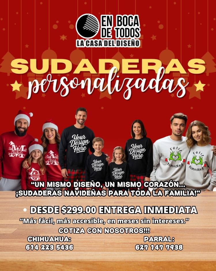 Con motivo de la temporada decembrina, En Boca de Todos – La Casa del Diseño puso en marcha una atractiva promoción de sudaderas personalizadas, pensadas para toda la familia y con entrega inmediata, convirtiéndose en una opción accesible y original para los regalos navideños.