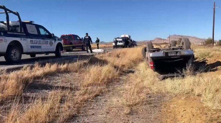Una fatal volcadura de una pickup en la carretera vía corta a Chihuahua dejó como saldo a un hombre sin vida; el fallecido salió proyectado de la camioneta.