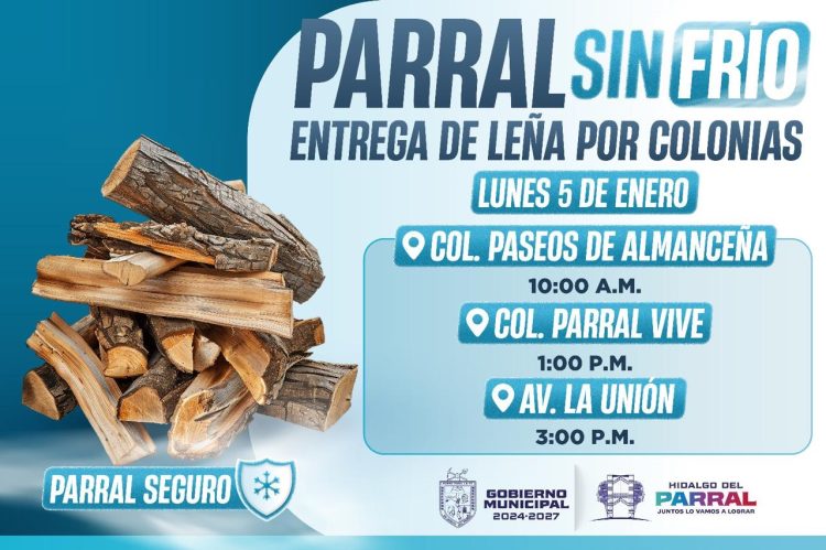 El Gobierno Municipal de Hidalgo del Parral informa que este lunes 5 de enero se llevará a cabo una jornada de entrega de leña en distintos puntos de la ciudad, como parte de la campaña “Parral sin Frío”, impulsada por el alcalde Salvador Calderón Aguirre, con el objetivo de brindar respaldo directo a los hogares que enfrentan condiciones más complejas durante la temporada invernal.