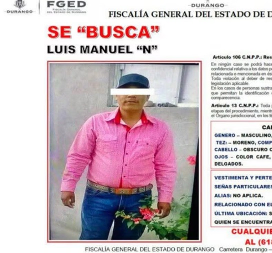 A través de una pesquisa, la FGE en el Estado de Durango, dio a conocer que se trabaja en la búsqueda de Luis Manuel N., quien es señalado como presunto responsable de la muerte de Marisol Gutiérrez.