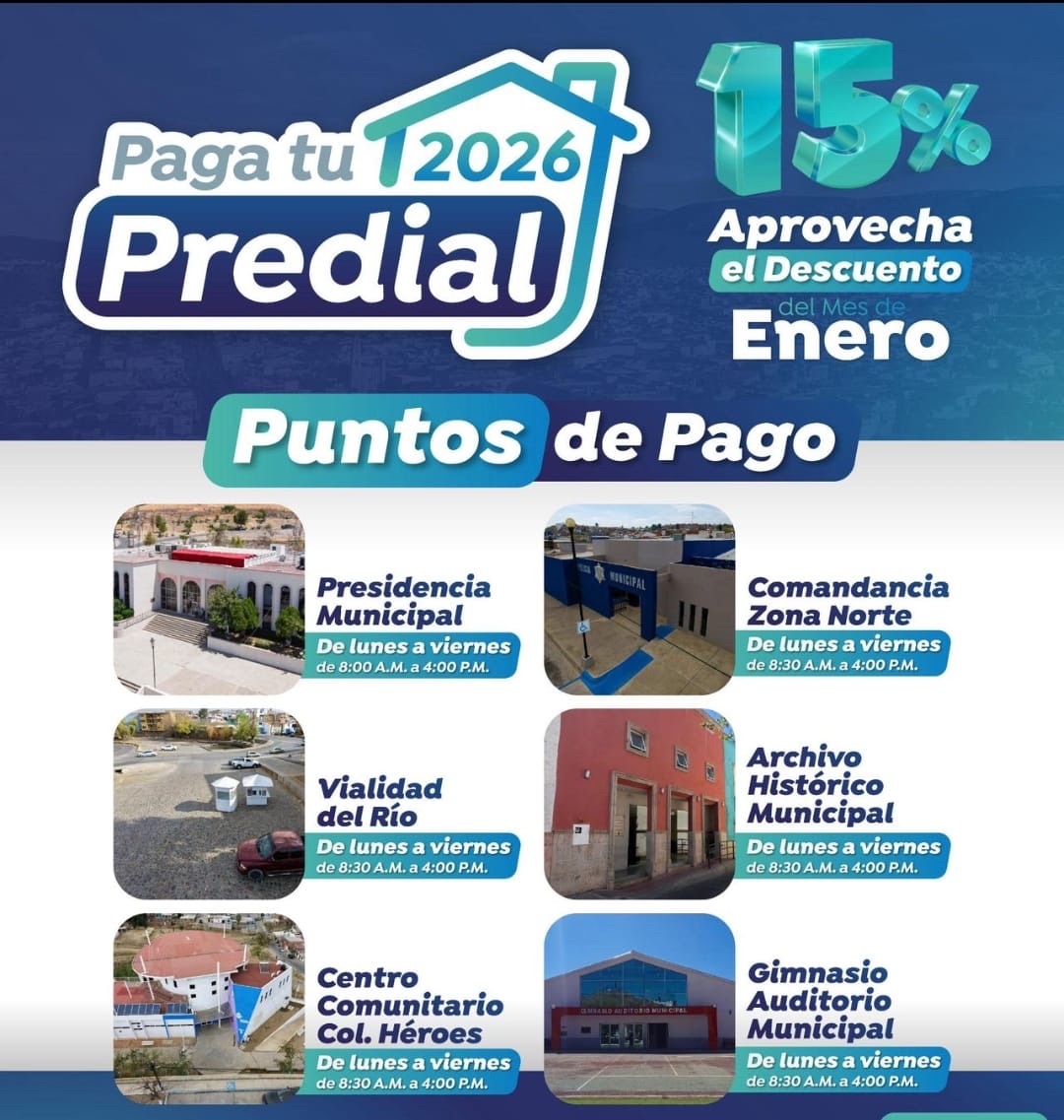 Con el objetivo de apoyar la economía de las familias parralenses, el Gobierno Municipal de Parral invita a la ciudadanía a aprovechar el 15 por ciento de descuento por pronto pago en el impuesto predial durante el mes de enero.