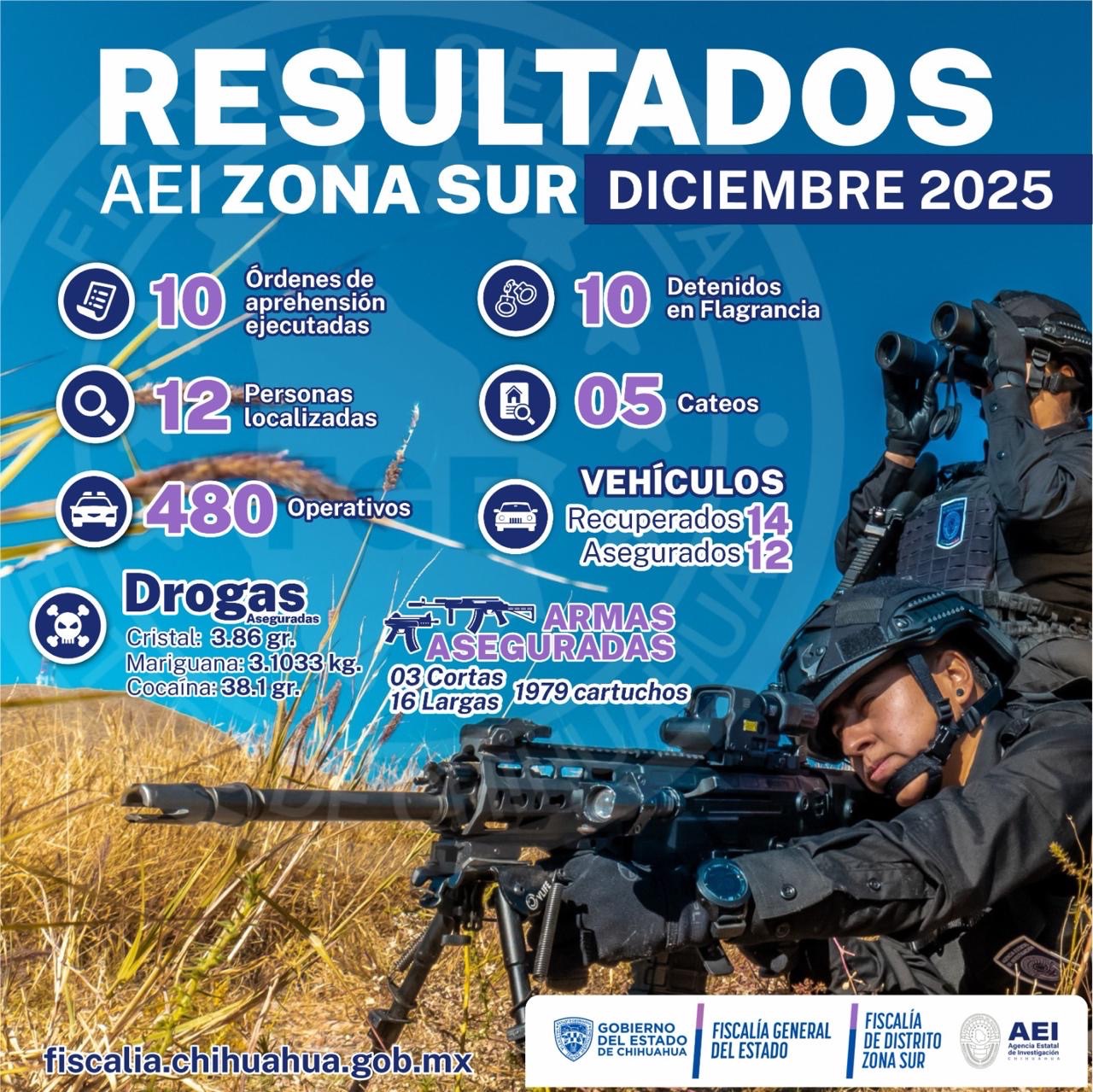 La Fiscalía de Distrito Zona Sur, a través de la Agencia Estatal de Investigación (AEI), informa los resultados obtenidos durante el mes de diciembre de 2025, derivados de las labores de investigación, prevención y reacción implementadas en la región.