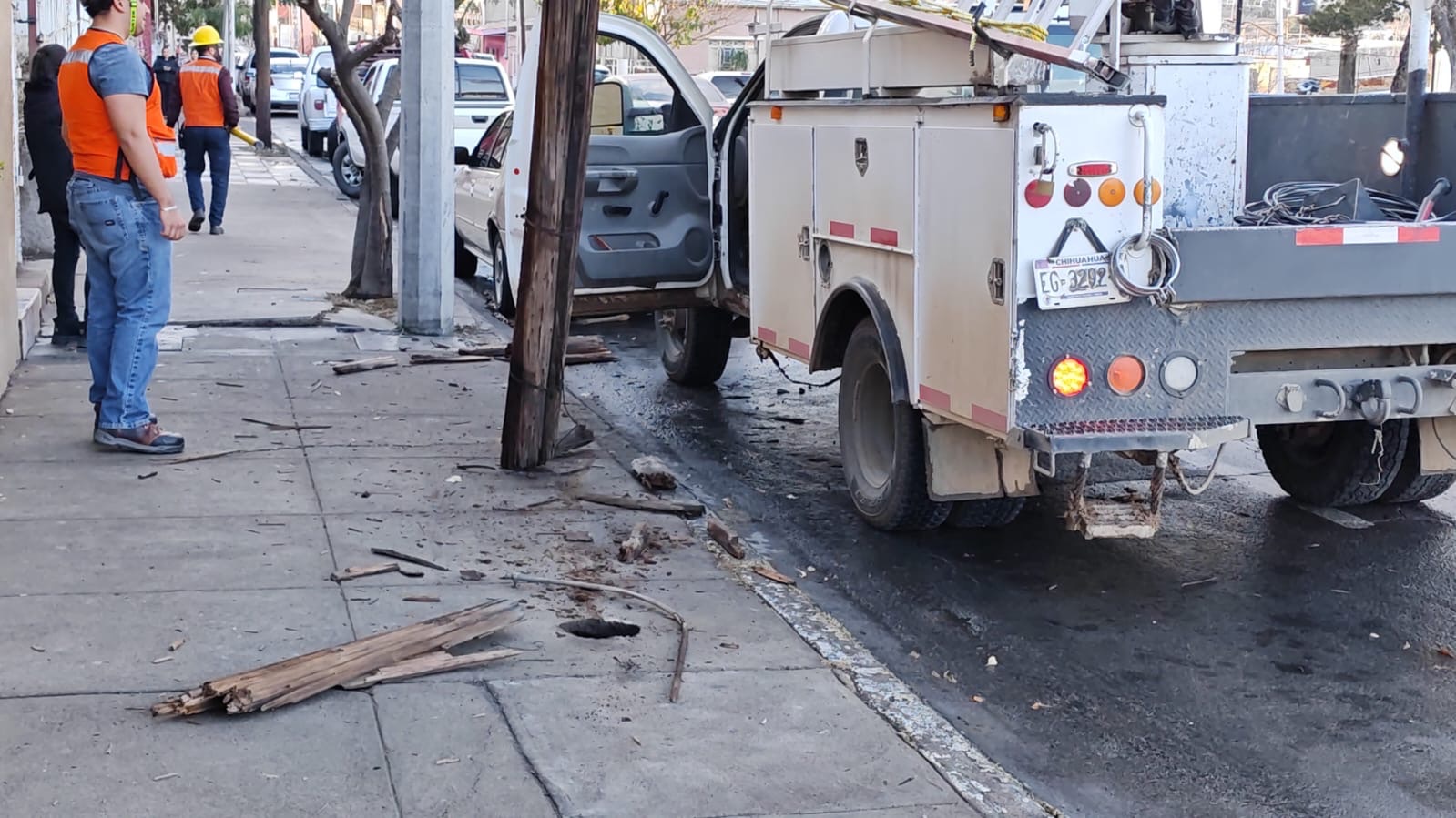 Tras el golpe, el poste quedó sostenido únicamente por los cables, por lo que se pidió el apoyo de personal de la CFE, ya que además había dejado sin energía eléctrica al sector.