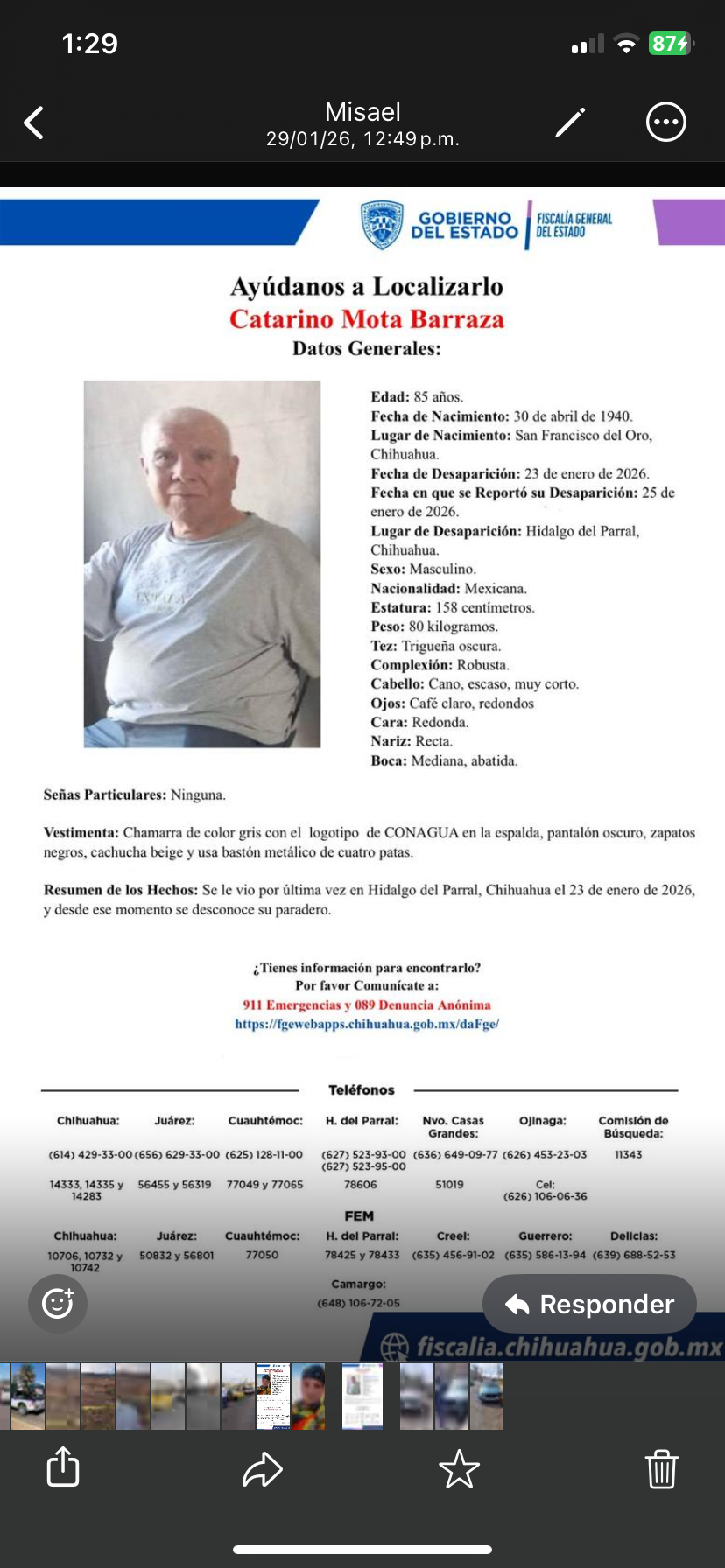 El señor Catarino desapareció desde el pasado viernes 23 de enero, pero fue reportada su desaparición hasta el domingo 25 de enero, cuando se emitió la ficha de búsqueda.