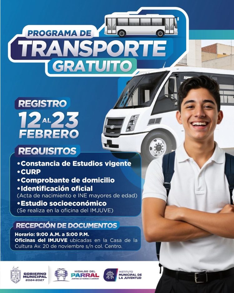 El Gobierno de Parral, a través del Instituto Municipal de la Juventud (IMJUVE), informa que continúa abierta la convocatoria para la recepción de documentos dirigida a todas y todos los estudiantes interesados en afiliarse al programa de transporte gratuito. Esta iniciativa busca apoyar la economía de las familias parralenses y fortalecer la permanencia escolar de la juventud. La convocatoria permanecerá vigente hasta el próximo 23 de febrero.