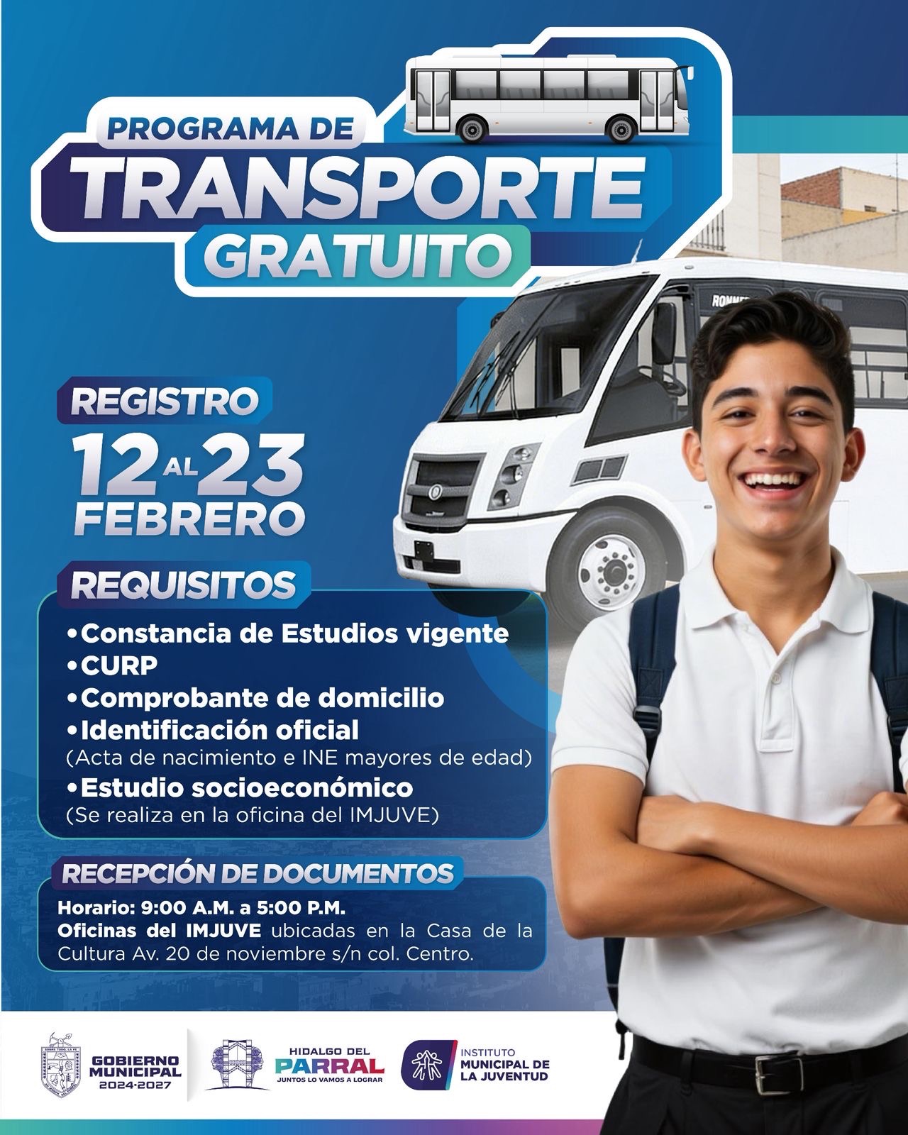 El Gobierno de Parral, a través del Instituto Municipal de la Juventud (IMJUVE), informa que continúa abierta la convocatoria para la recepción de documentos dirigida a todas y todos los estudiantes interesados en afiliarse al programa de transporte gratuito. Esta iniciativa busca apoyar la economía de las familias parralenses y fortalecer la permanencia escolar de la juventud. La convocatoria permanecerá vigente hasta el próximo 23 de febrero.