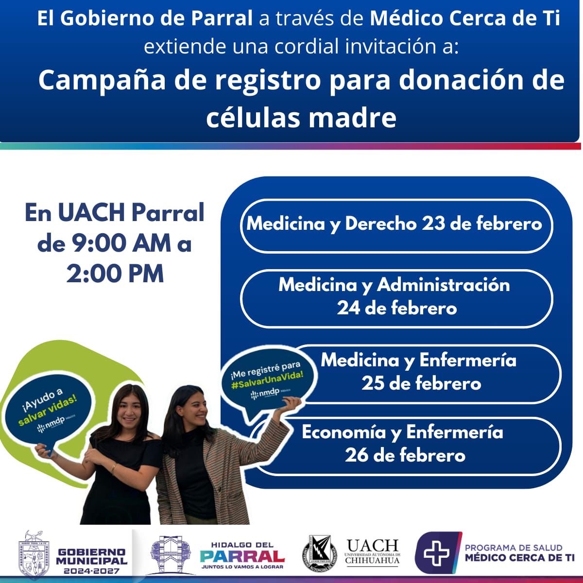 El Gobierno de Parral, a través del programa Médico Cerca de Ti, extiende una cordial invitación a la ciudadanía a participar en la Campaña de Registro para Donación de Células Madre, que se llevará a cabo del 23 al 26 de febrero en la Universidad Autónoma de Chihuahua (UACH), Campus Parral. Esta iniciativa tiene como objetivo fomentar la cultura de la donación y brindar esperanza a pacientes que requieren un trasplante para salvar su vida.