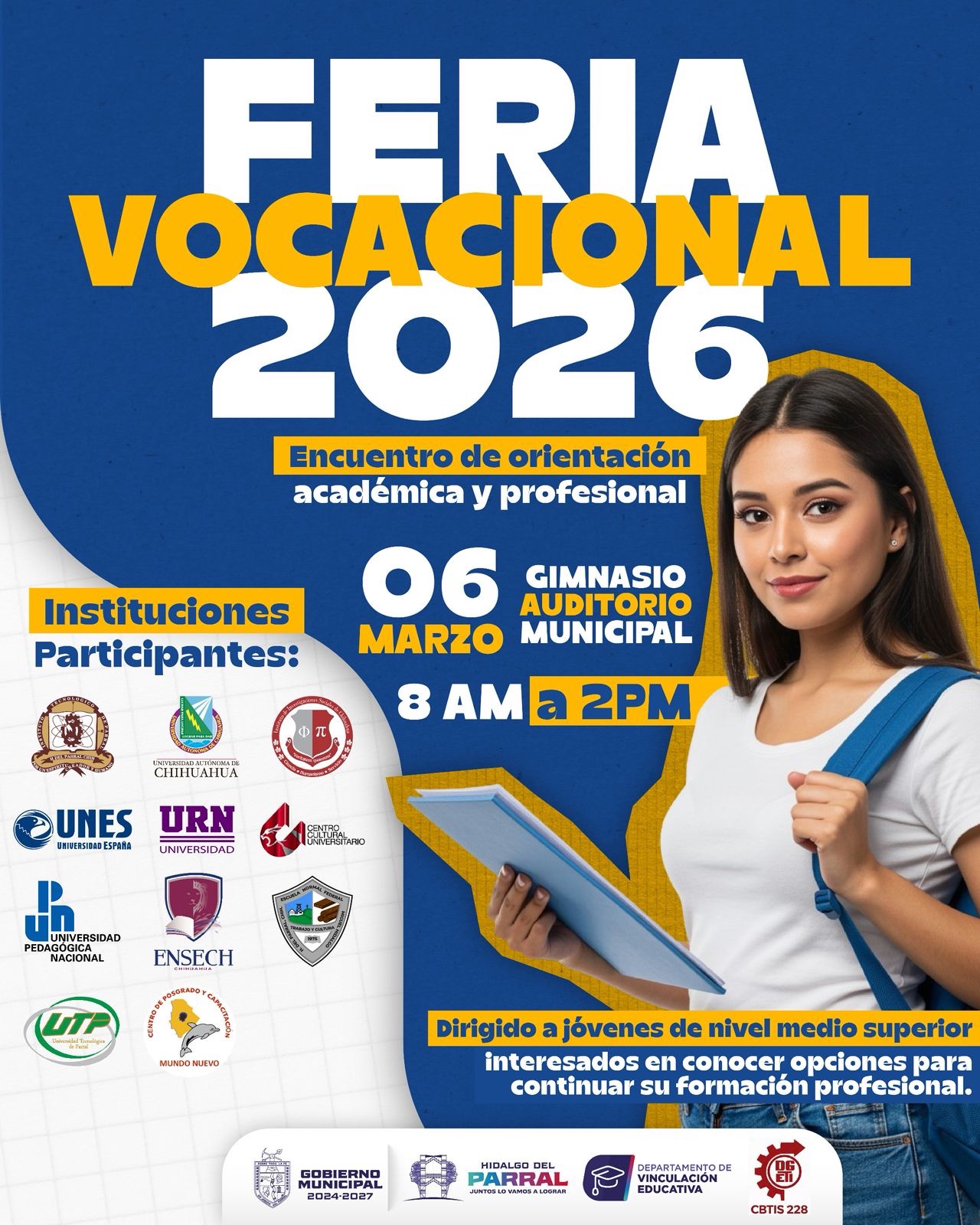 El Gobierno de Parral encabezado por el alcalde Salvador Calderón Aguirre, a través del Departamento de Vinculación Educativa, invita a los estudiantes de nivel medio superior a la «Feria Vocacional” un encuentro de orientación académica y profesional. Este evento se llevará a cabo el próximo 06 de marzo de 2026 en las instalaciones del Gimnasio Auditorio Municipal, con un horario de atención de 8:00 de la mañana a 2:00 de la tarde.