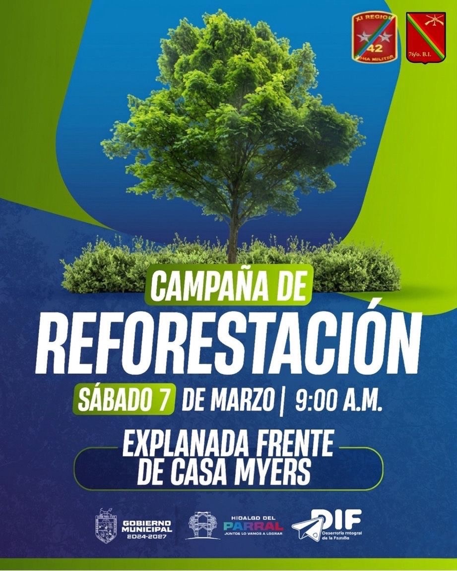El Gobierno de Parral invita a toda la ciudadanía a participar en la campaña de reforestación que se llevará a cabo el sábado 07 de marzo a las 9:00 de la mañana, teniendo como punto de encuentro el área frente a Casa Myers. Esta actividad tiene como objetivo fortalecer el cuidado del medio ambiente y promover la recuperación de espacios verdes en beneficio de las familias parralenses.