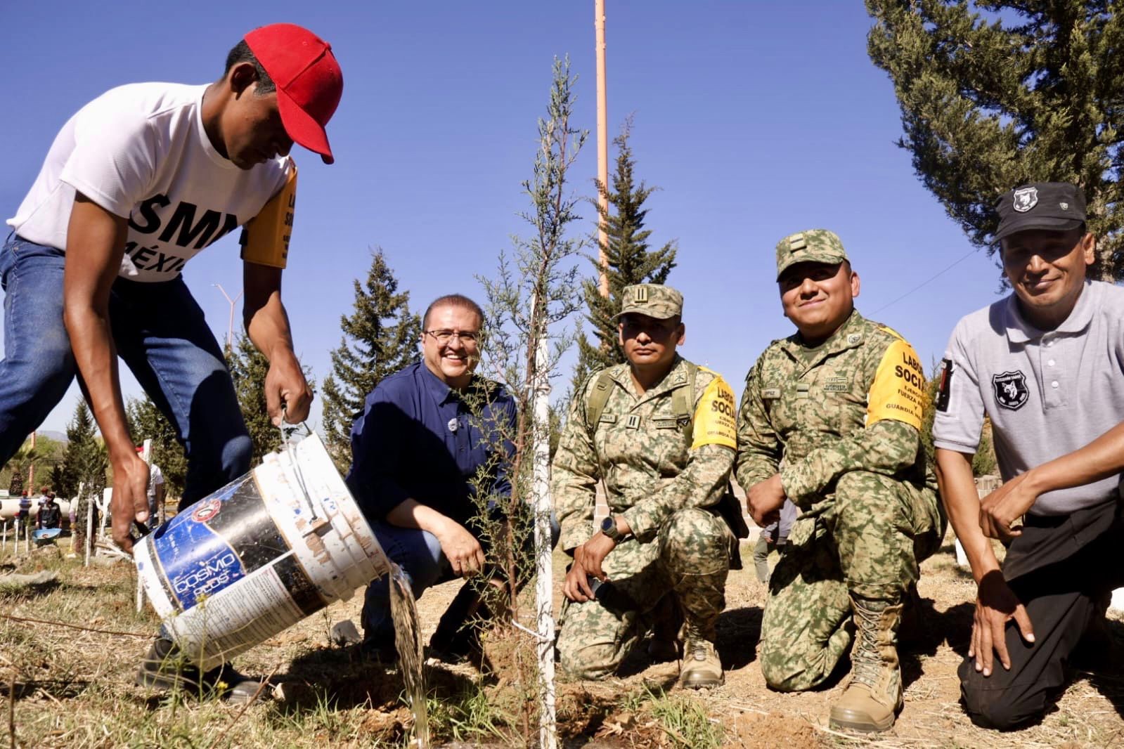 La jornada se realizó en coordinación con elementos del 76 Batallón de Infantería y de la 42 Zona Militar, así como con la participación del DIF Municipal, el Escuadrón Lobos y organismos de la sociedad civil organizada, quienes plantaron 70 ciprés y 20 fresnos, sumando esfuerzos para mejorar diversos espacios públicos.