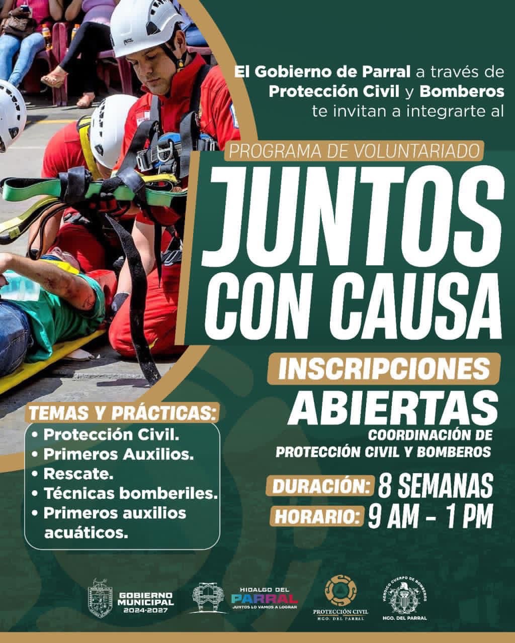 El Gobierno de Parral, a través de la Coordinación Municipal de Protección Civil y Bomberos, lanzó la convocatoria para integrarse al voluntariado “Juntos con Causa”, dirigido a personas mayores de 15 años interesadas en adquirir conocimientos y habilidades en atención a emergencias, con el objetivo de fortalecer la participación ciudadana en acciones preventivas y de auxilio.