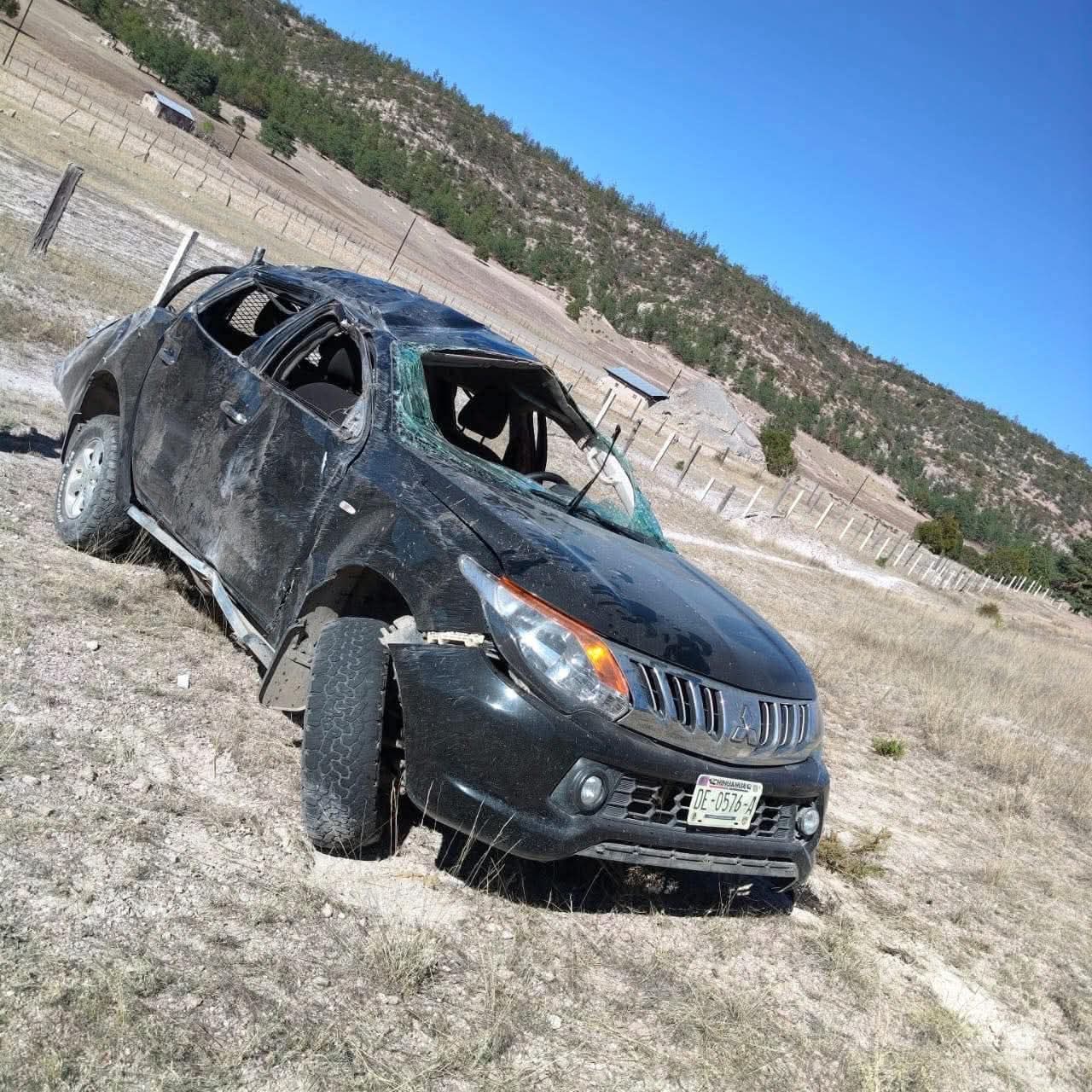 Al llegar al lugar se tuvo a la vista fuera de la cinta asfáltica una camioneta de la marca Mitsubishi, línea L200, color negra, modelo 2016, con placas del estado de Chihuahua.