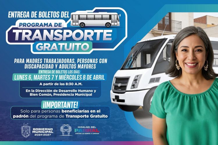 El Gobierno de Parral, a través de la Dirección de Desarrollo Humano y Bien Común, informa a las y los beneficiarios del programa Transporte Gratuito que la entrega de boletos correspondientes al mes de abril se realizará del 6 al 8 del presente mes.