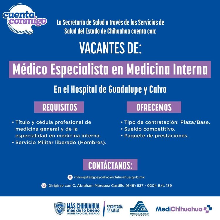 Asimismo, se destacó que esta es una oportunidad para formar parte del equipo de salud en el estado, participando activamente en la atención y bienestar de la población chihuahuense.