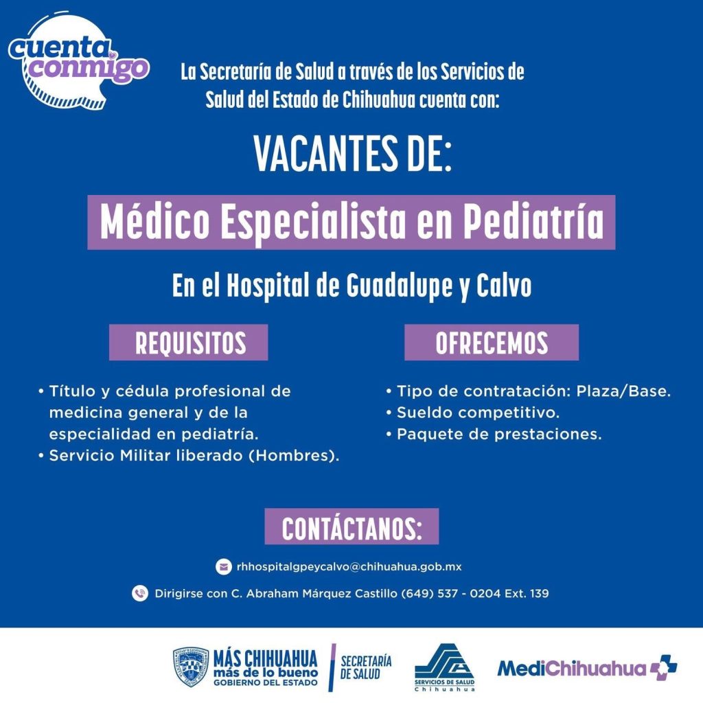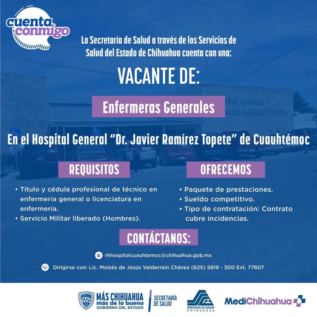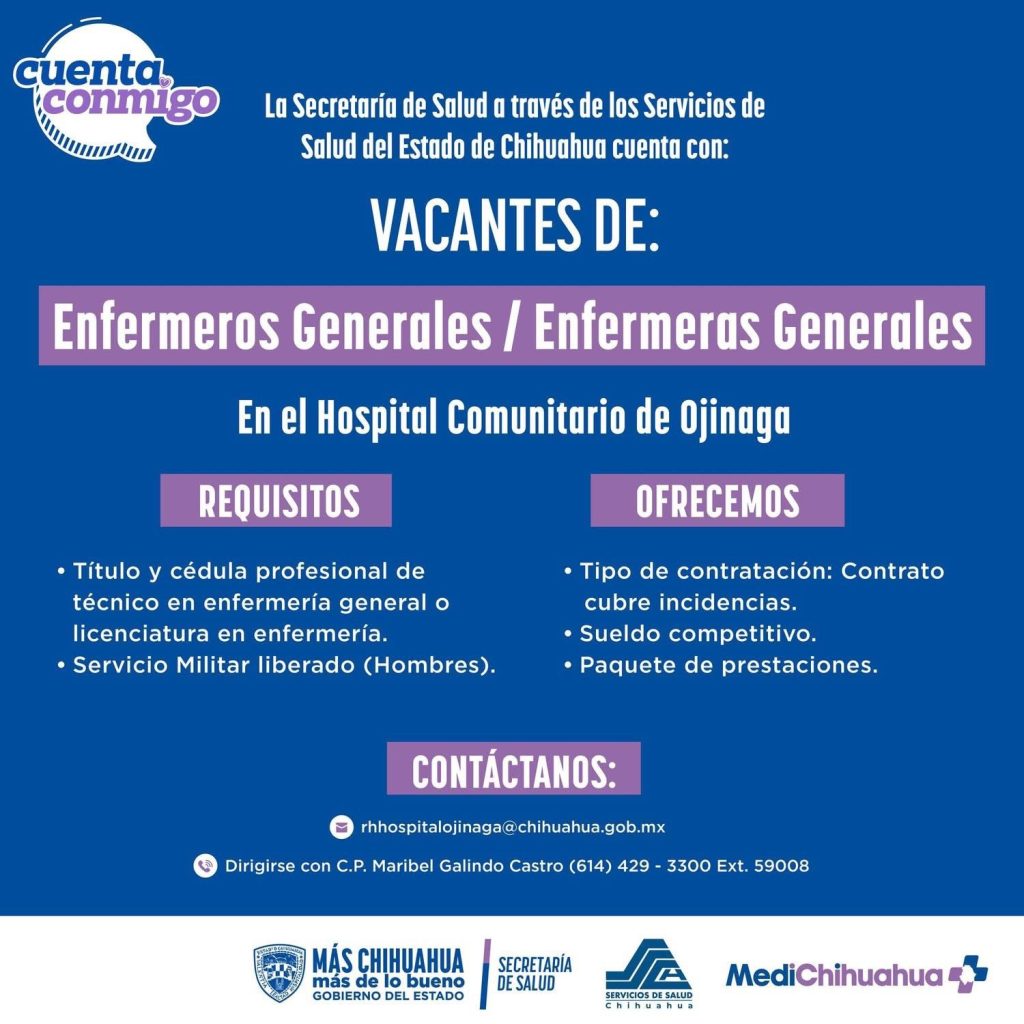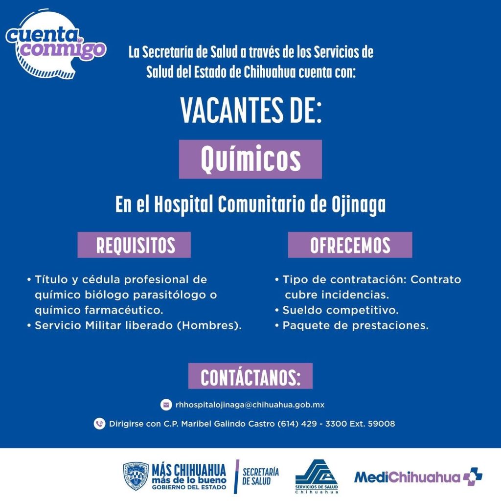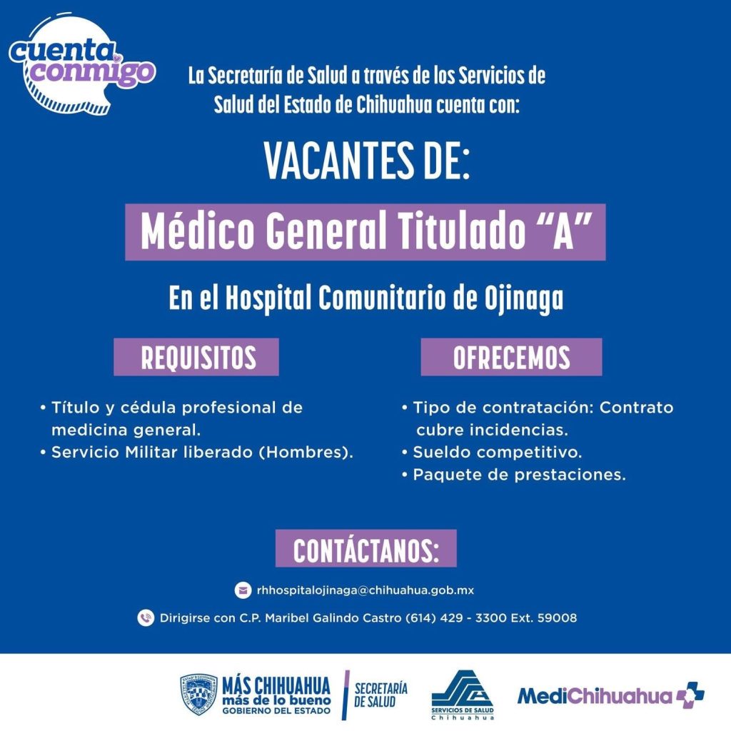 Con el objetivo de reforzar los servicios de atención a la población, la Secretaría de Salud del Estado de Chihuahua, a través de los Servicios de Salud, anunció la disponibilidad de diversas vacantes en unidades médicas distribuidas en la entidad.