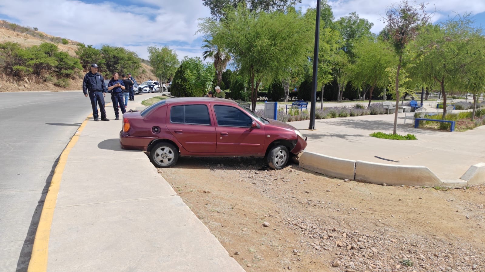 Se trató de un auto de la marca Nissan, línea Platina, color guinda, modelo aproximado 2005, el cual presentó daños en la parte frontal tras chocar contra la guarnición del parque.