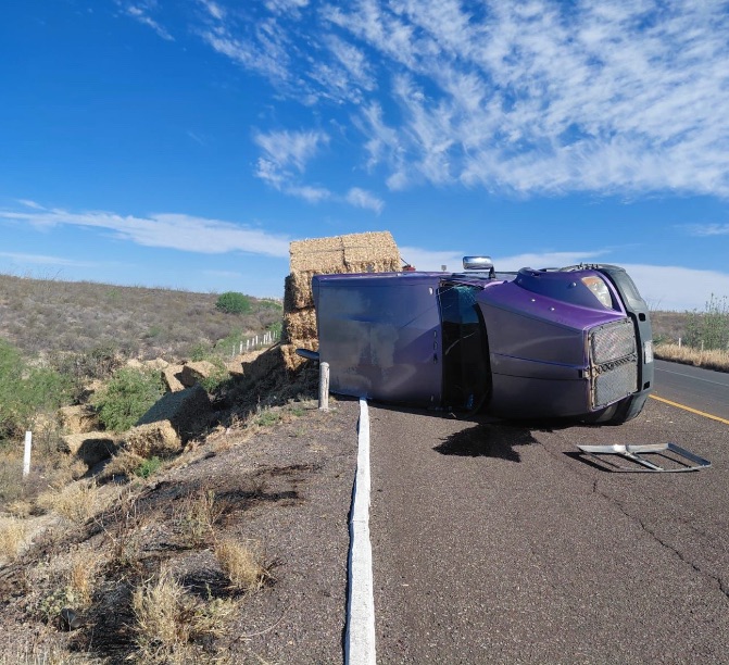 Al acudir la lugar se localizó dentro de la cinta asfáltica un tráiler volcado sobre su costado derecho, siendo uno de la marca Internacional, color morado, mismo que transportaba pacas de pastura al momento del percance.