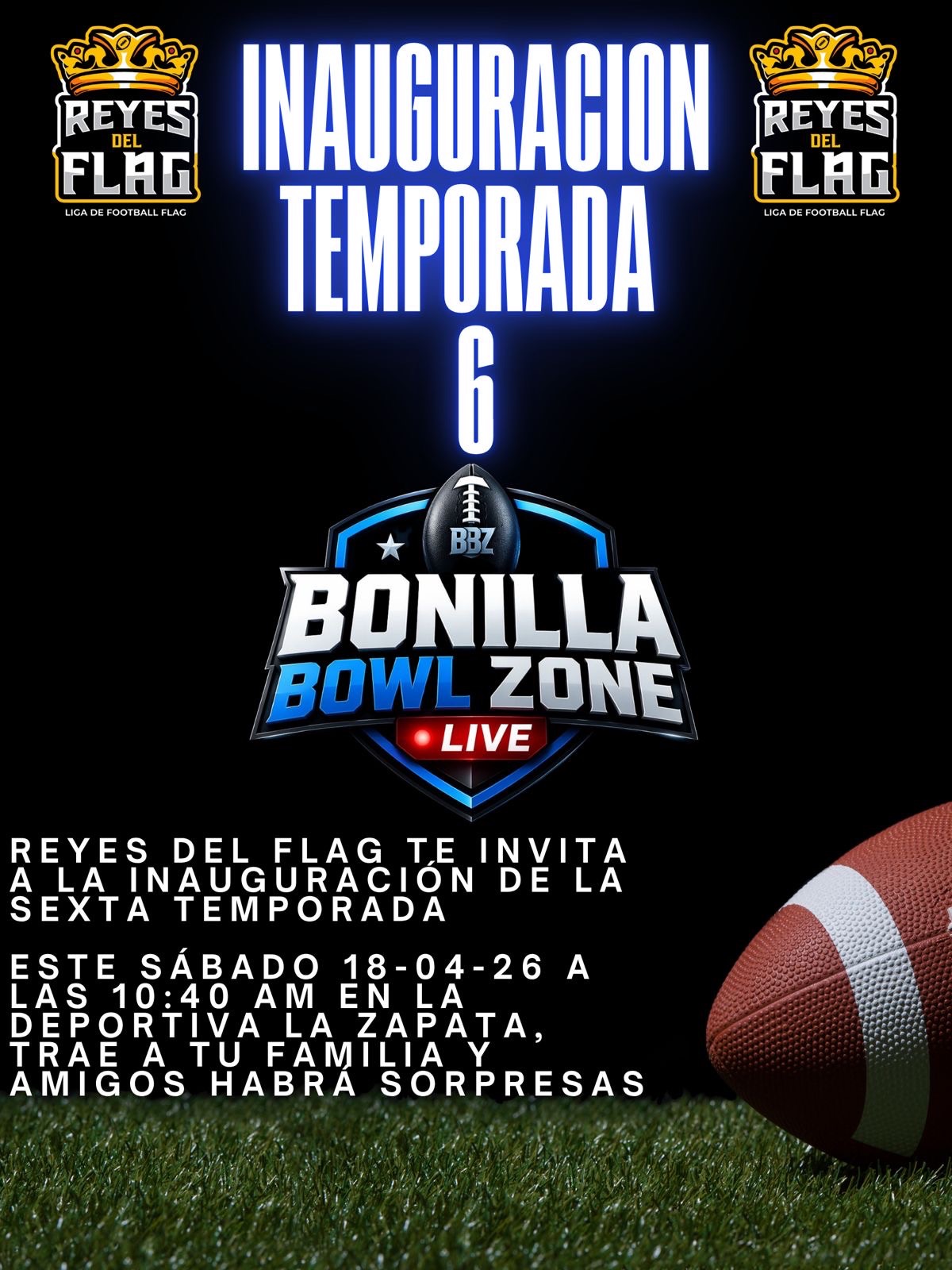En un ambiente totalmente familiar y lleno de actividades recreativas, la liga Reyes del Flag invita a toda la ciudadanía a ser parte de la inauguración de la Temporada 6 del “Bonilla Bowl Zone Live”, evento que promete una mañana de convivencia, deporte y diversión para todas las edades.